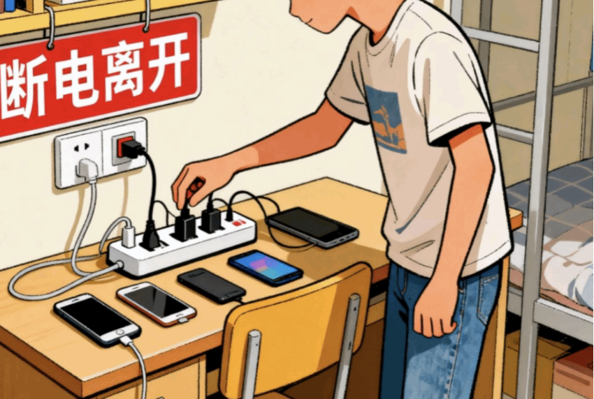 2.用电安全:离开宿舍前,关闭电脑、充电器等电器的电源。不在床铺上给手机等设备充电,避免过热引发火灾。