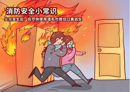 当火灾来临时,必须掌握一些相关的火灾逃生技能以及报警。用湿毛巾、衣物捂住口鼻,弯腰低姿前行,避免吸入高温有毒烟雾;优先走疏散楼梯,严禁乘坐电梯,若电梯间浓烟封锁,立即退回房间。用湿布条塞门缝,在窗口挥舞鲜艳物品求救;熟悉所在场所安全出口位置。逃生时不贪恋财物,不盲目跟随他人,若身上着火,就地打滚灭火,不可奔跑。