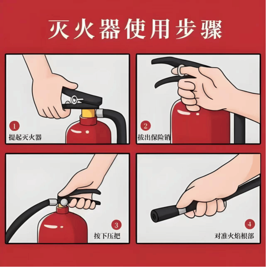 遇火灾需要遵循先判断,再处置、保生命的原则,分步骤科学应对。若火势小(如电器、油锅小火)立即用对应方式处置:电器起火先断电,用干粉灭火器扑救,油火用锅盖或者灭火毯盖灭,忌用水,使用灭火器,牢记“提、拔、握、压”四步,对准火焰根部喷射。
