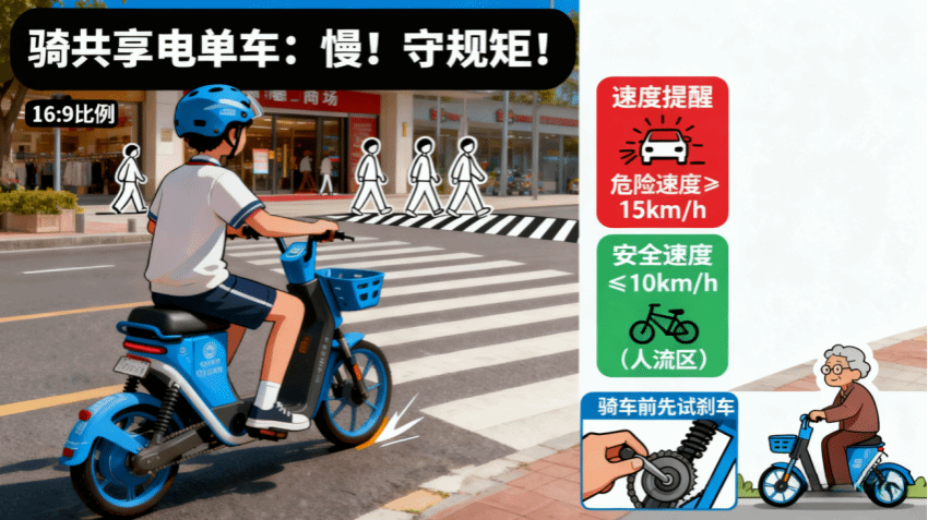 先说速度的事儿。共享电单车最快能骑到 25 公里 / 小时,但不是所有地方都能开这么快。比如在商圈门口、学校附近,人特别多,说不定谁突然就横穿马路了,这时候要是开得比 10 公里 / 小时还快,想刹车都来不及,很可能撞到人;就算在没人的非机动车道,也别开太快,最多 15 公里 / 小时就够了 —— 毕竟电单车的刹车没汽车那么好用,路滑或者刹车有点问题的话,开得越快越停不下来。