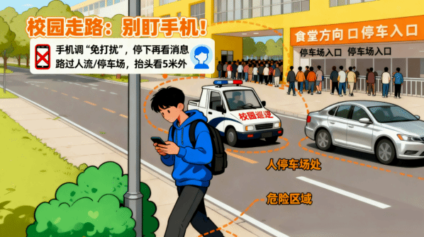 实用小技巧:走路时把手机调成 “免打扰”,想看消息就先走到路边停下,确认周围安全了再看;路过教学楼门口、停车场这些地方,或者转弯的时候,多抬头看看前面,保证能看到 5 米外的情况,这样就不容易出事。