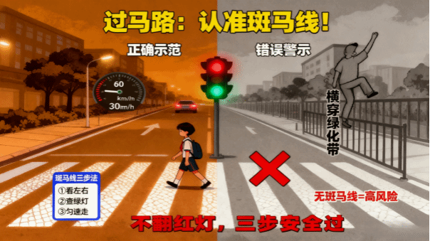 实用小技巧:过马路就记 “三步法”:第一步,站在路边看看左右有没有车过来,确认没车再动;第二步,走到斑马线上,看看红绿灯是不是绿灯(有红绿灯的话);第三步,赶紧匀速走过去,别在斑马线上停着,也别走一半又回头,不然司机不好判断,容易出问题。