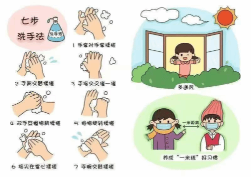 使用肥皂/洗手液和流动水,按照“七步洗手法”认真清洁,尤其在接触公共物品、就餐前、咳嗽打喷嚏后。