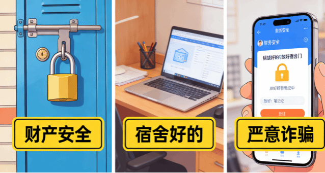 1.宿舍防盗:离开宿舍时务必锁门,贵重物品(电脑、平板等)不要放在显眼位置。