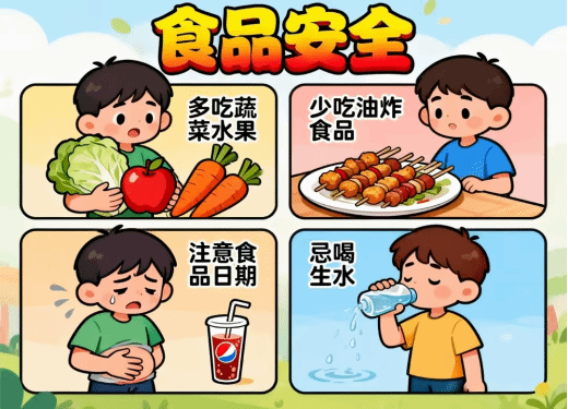 优先在学校食堂或有资质的超市买食品,远离无证摊贩和“三无”食品。比如,别贪便宜买路边摊的烤串,既不卫生又没保障,小心吃坏肚子哦!
