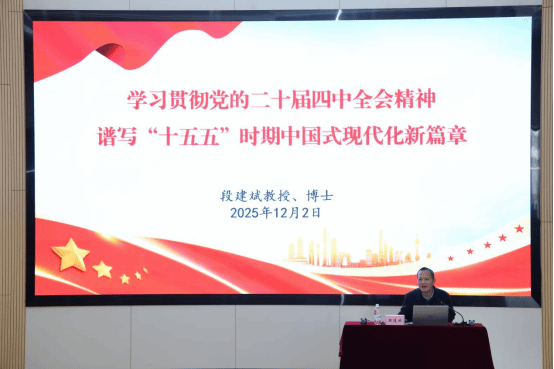 段建斌教授的宣讲紧扣《中共中央关于制定国民经济和社会发展第十五个五年规划的建议》核心要义,以“中国式现代化”为主线,从“十四五”成就总结到“十五五”战略部署,层层深入、鞭辟入里。他既深刻阐释了“坚持以经济建设为中心”“推动全体人民共同富裕”的本质要求,又聚焦“高水平科技自立自强”“发展新质生产力” 等战略任务,更重点解读了全会对教育、科技、人才“三位一体”协同发展的系统部署,清晰指明了三者“内在一致、相互支撑”的内在规律。