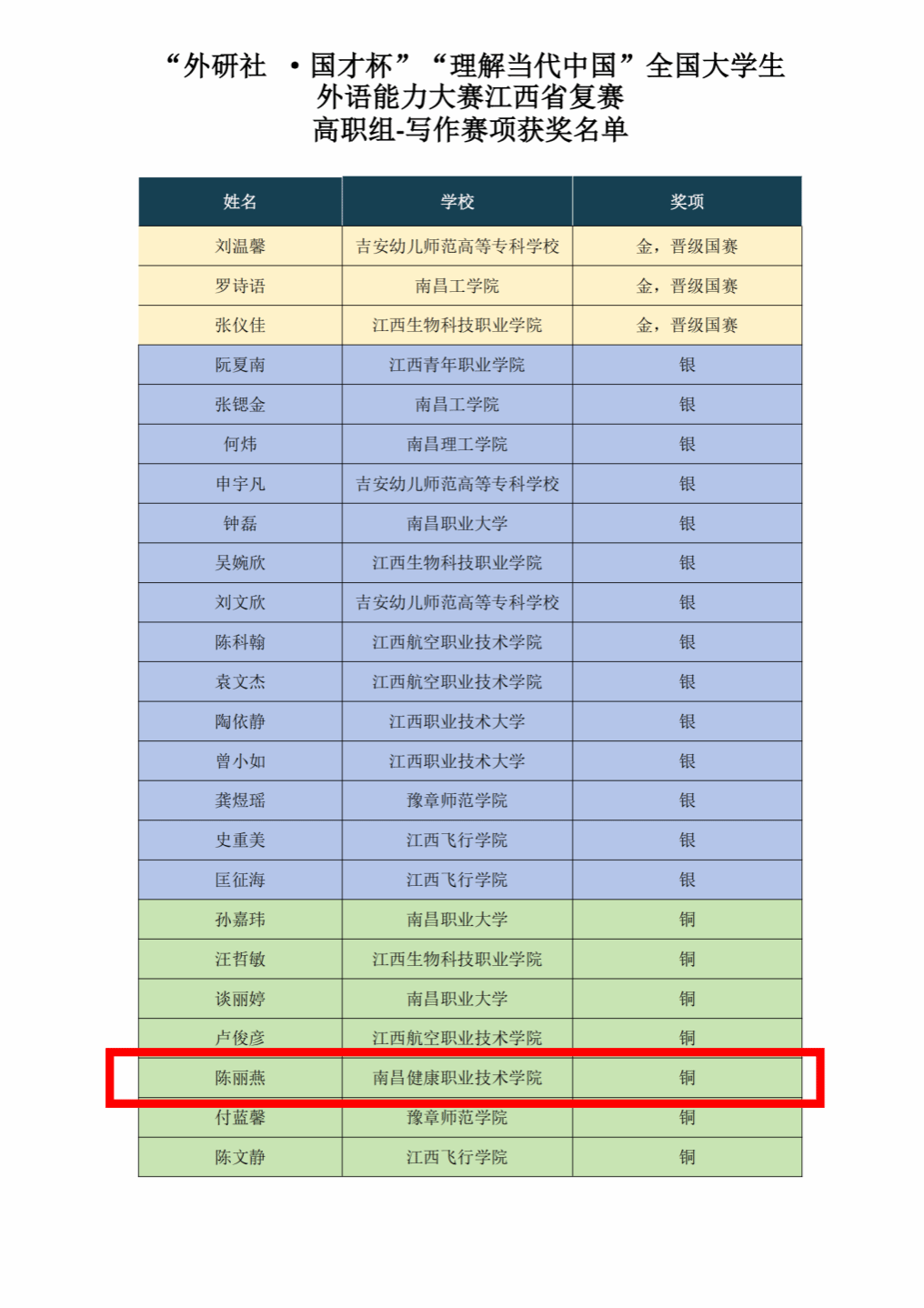 近日,2025年“外研社·国才杯”“理解当代中国”全国大学生外语能力大赛江西省赛在江西中医药大学湾里校区圆满落幕。我校25级药学1班陈丽燕同学表现优异,在高职组写作赛项中荣获铜奖。