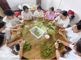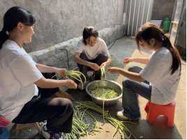 实践队队员们走进乡村厨房,融入乡土烟火之中。大家分工协作,默契配合:围坐桌前的队员专注剥着毛豆,翠绿的豆粒在掌心汇聚成堆;穿梭在后厨的队员细致摘除豆角蒂把,将其折成均匀小段;另有队员在灶台边将辣椒去蒂切碎,辣香与烟火气交织弥漫。开饭前,几位队员主动打包热饭热菜,沿着村道送往行动不便的老人家中。指尖沾染的豆荚清香、饭菜蒸腾的热气、老人接过餐盒时的笑脸,让队员们在劳作中触摸乡土脉搏,于质朴温情中读懂乡村生活的真谛。
