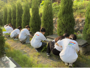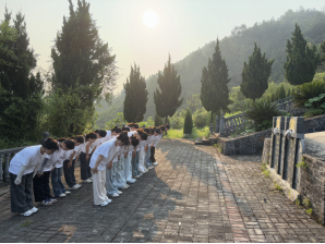 骄阳灼灼,映照山河。实践队队员们怀着肃穆崇敬之情,首先奔赴贺国庆烈士陵园。园内松柏苍翠如黛,烈士丰碑巍然矗立。队员们俯身为烈士墓碑清除周边杂草,以指尖的温度拂去岁月的尘埃;随后整齐列队,向英烈三鞠躬,在静默中追思革命先辈的峥嵘岁月,深切缅怀他们为家国安宁立下的不朽功勋。