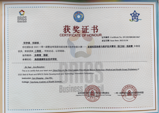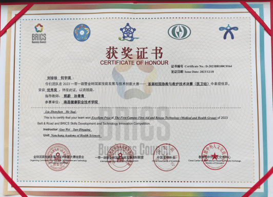 项目名称:2023一带一路暨金砖国家技能发展与技术创新大赛首届校园急救与救护技术竞赛(主办单位:金砖围家工商理事会中方理事会、一带一路暨金砖国家技能发展国际联盟、中国科协一带一路暨金砖国家技能发展与技术创新培训中心)