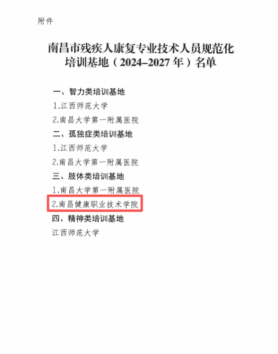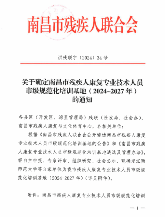 1. 2024年 南昌市残疾人康复专业技术人员规范化培训基地(2024-2027年)