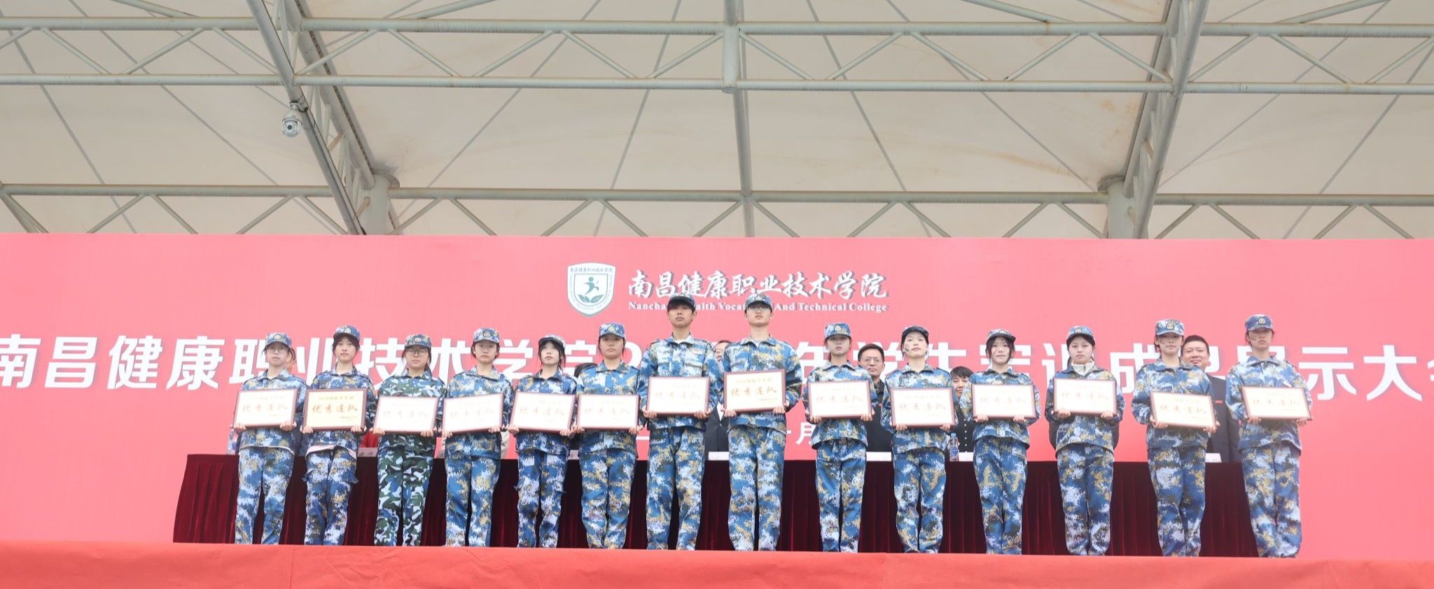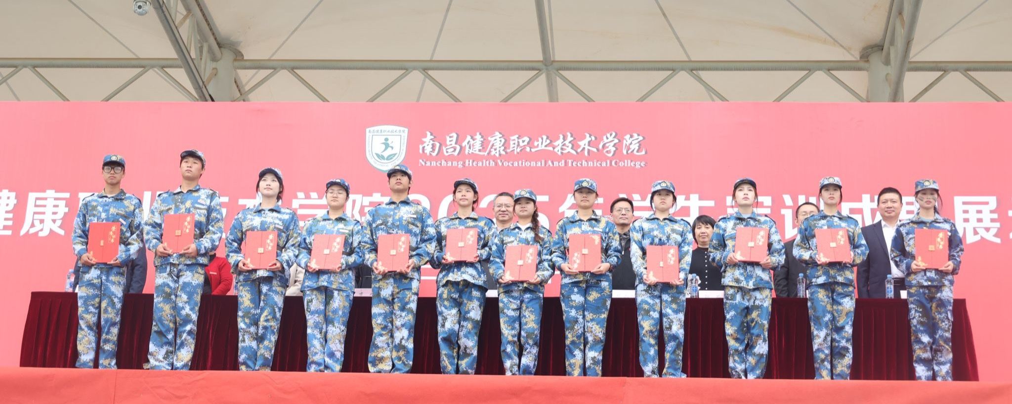 学生工作处负责人宣读《南昌健康职业技术学院关于表彰2025级新生军训先进集体和个人的通报》后,校领导与四系党支部书记共同为优秀学员、优秀连队代表颁发荣誉证书。