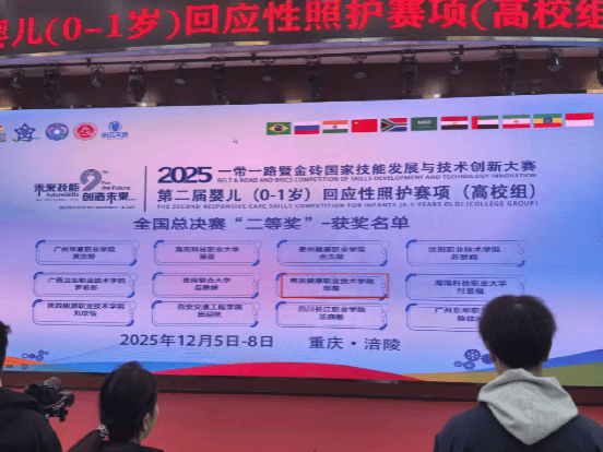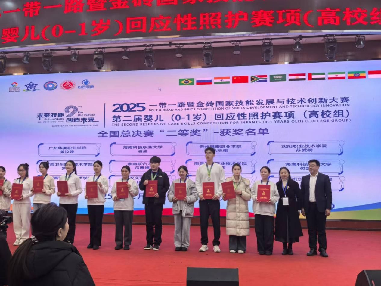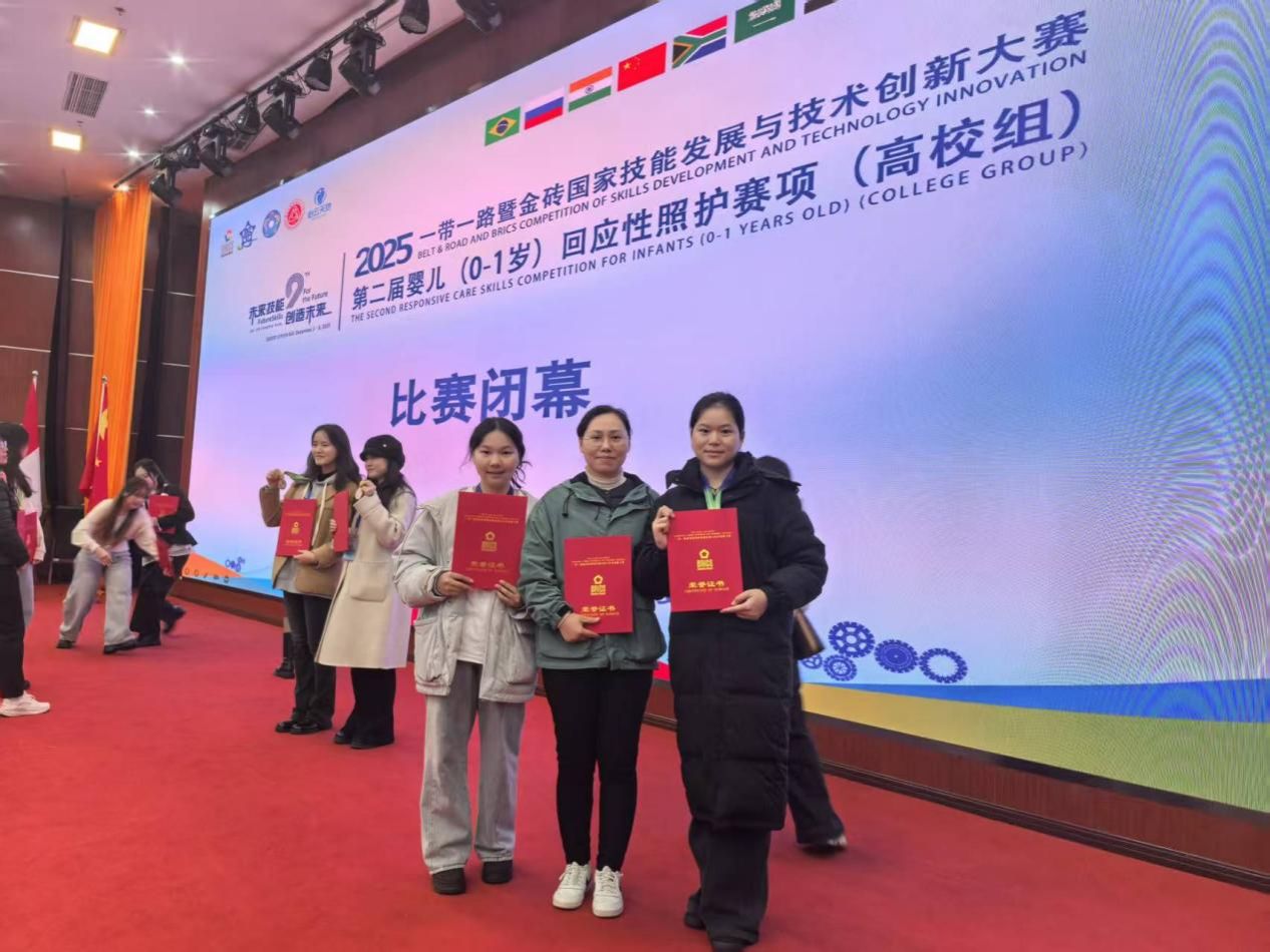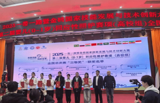 在2025年“一带一路”暨金砖国家技能发展与技术创新大赛——第二届婴儿(0-1岁)回应性照护中、高职全国总决赛中,我校学子凭借扎实的专业功底与出色的现场表现,在全国赛场上脱颖而出,斩获多项荣誉。