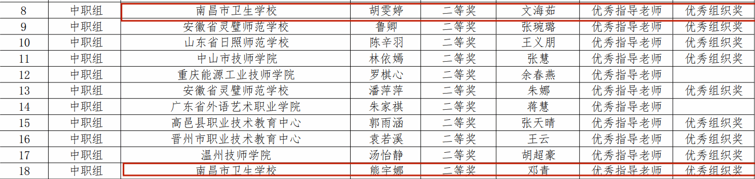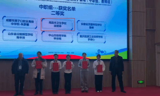 其中,中职选手熊宇娜、胡雯婷均荣获二等奖;高职选手邓蕊、黄榕分获二等奖与三等奖。指导教师邓青、胡蓉、文海茹获评“优秀指导教师”,学校中、高职组别均荣获“优秀组织奖”。