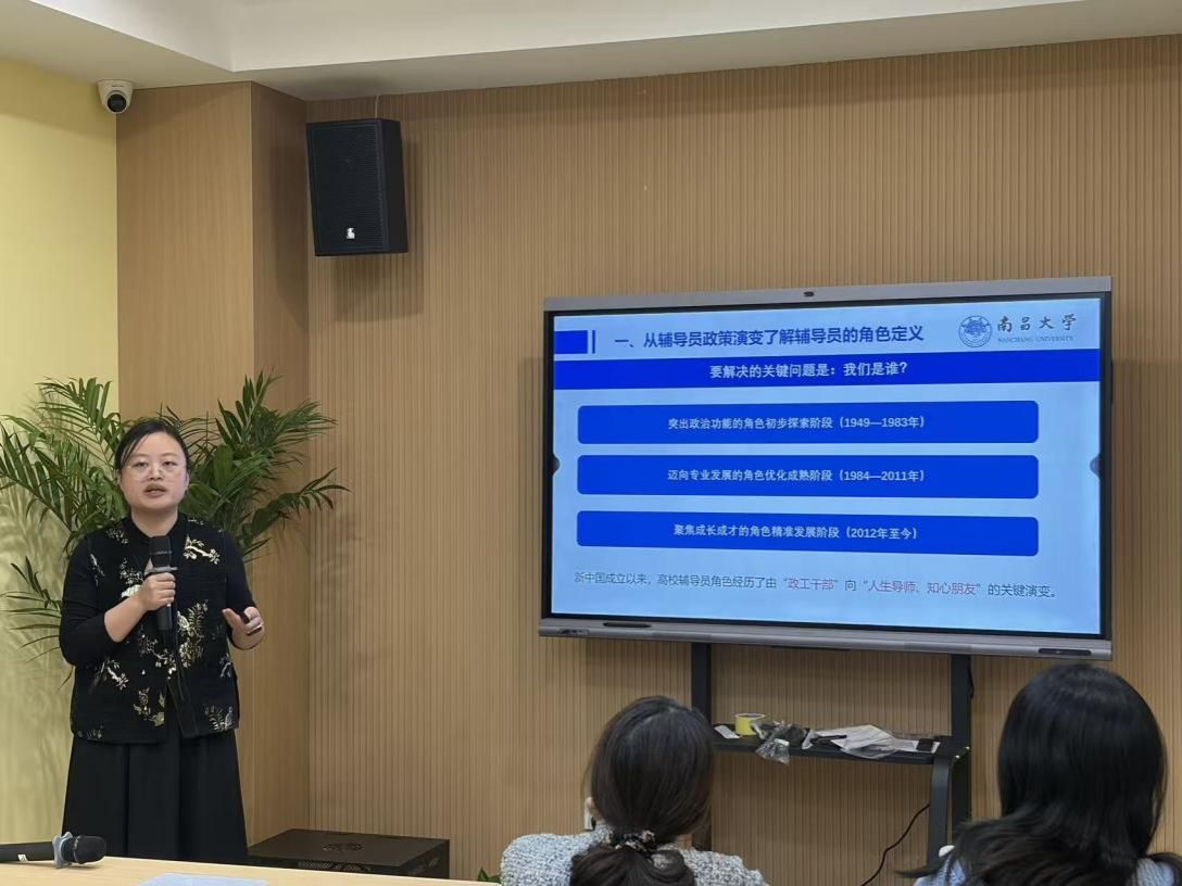 王葳结合自身丰富的参赛经验,深入剖析全国及江西省辅导员素质能力大赛的赛制演变脉络与最新动态,重点从基础知识测试、案例研讨、谈心谈话、学情分析四个环节展开阐述。在理论知识环节,她分享了高效记忆方法与高频考点梳理,帮助大家夯实政策理论根基。在案例研讨环节,她传授了“定性、思路、举措、启示”的系统解题框架,通过真实案例提升问题研判与解决能力。在谈心谈话环节,她着重阐释了如何通过建立信任、有效倾听与价值引导,实现沟通育人实效。在学情分析环节,她系统讲解了如何从基础数据中提炼问题、梳理归因并形成研判。在交流互动环节,王葳与参会辅导员们围绕大赛与工作实际,针对常见困惑展开深度研讨与经验分享,切实推动学习成果向实践赋能转化。