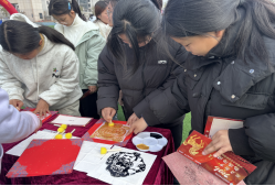 三大主题区域各具特色,人气爆棚。集福纳新区内,“拓福”“投福”“聚福”“迎福”等游戏趣味十足,两位校领导兴致盎然地加入其中,同学们更是专注参与其中,或相互切磋技巧,或为同伴加油鼓劲,现场互动氛围热烈而融洽。在“拓福”活动中,大家将红色福纸平铺于模板之上,手持蘸墨拓棒轻轻拍打,一幅幅字迹清晰、寓意吉祥的福字拓印作品相继诞生,不仅感受到了传统民俗的魅力,更将满满的新年祝福融入其中。