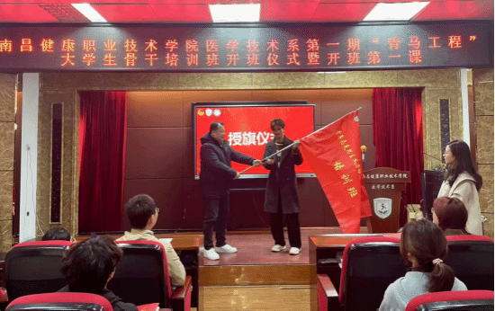 医学技术系党支部书记黄肇新为第一期“青马工程”大学生骨干培训班授旗。