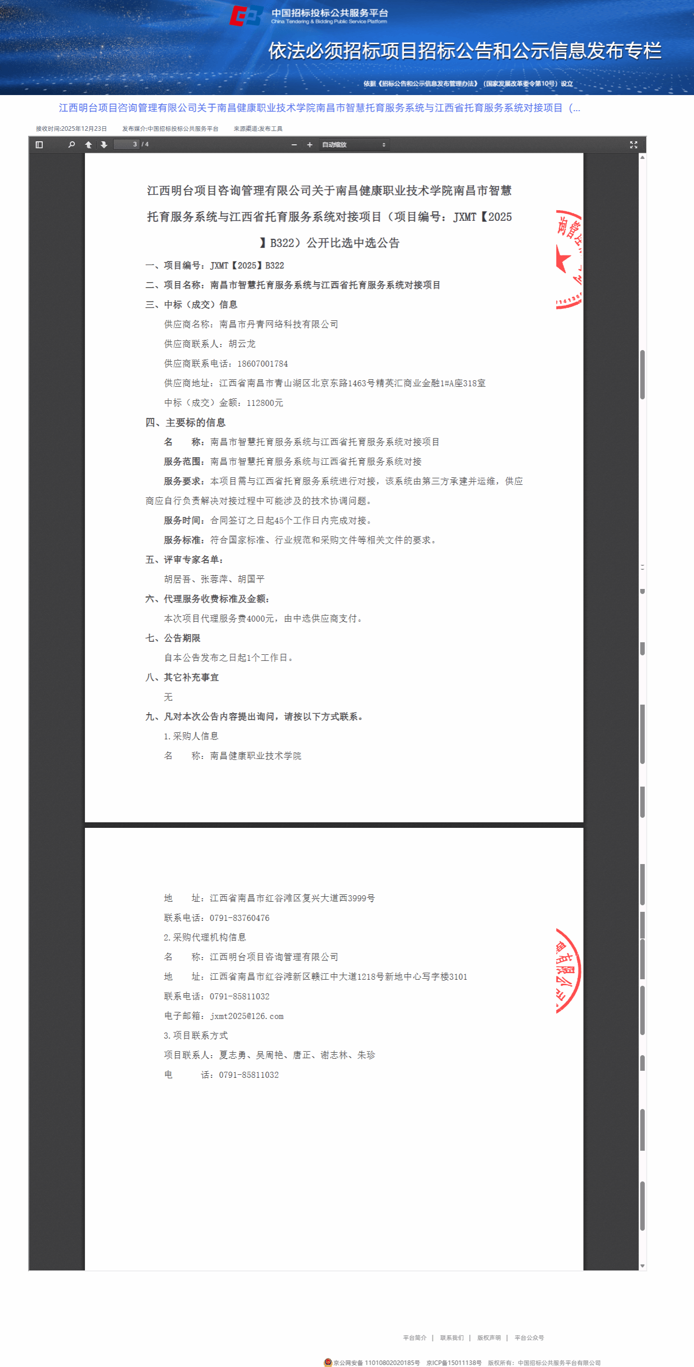 江西明台项目咨询管理有限公司关于南昌健康职业技术学院南昌市智慧托育服务系统与江西省托育服务系统对接项目(项目编号:JXMT【2025】B322)公开比选中选公告