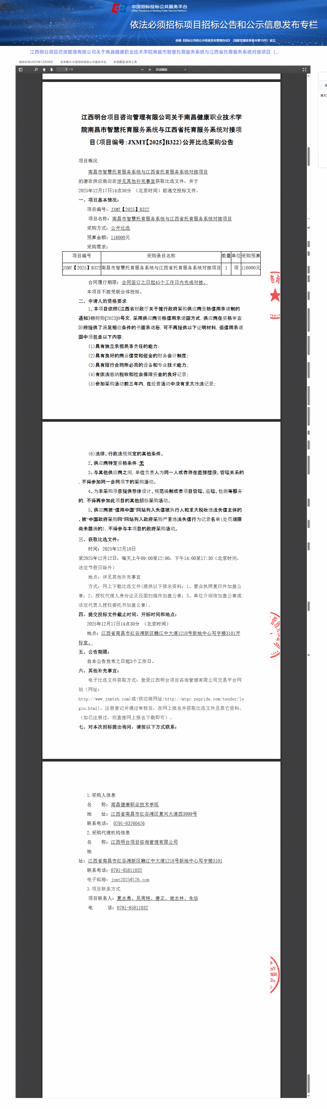 江西明台项目咨询管理有限公司关于南昌健康职业技术学院南昌市智慧托育服务系统与江西省托育服务系统对接项目(项目编号:JXMT【2025】B322)公开比选采购公告
