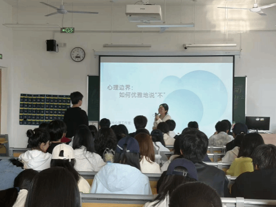 2025年10月28日下午,卢涛阳光心理工作室聚焦学生社交核心需求,于教12-203教室开讲“心理边界:如何优雅地说‘不’”专题讲座。工作室讲师陈占珑以趣味十足的互动设计与实用落地的真题内容分享为亮点,吸引200余名同学踊跃参与,刚踏入教室,便能从大家专注的眼神里,清晰感受到对社交心理知识的热切期待。