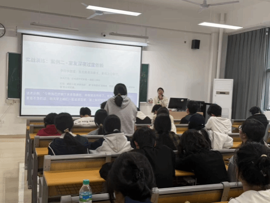 讲座过程中,陈老师始终以“实用性”为核心,结合校园常见社交场景拆解“拒绝技巧”。他强调:“优雅说‘不’不是断绝关系,而是明确自身需求的合理表达。”针对“担心拒绝会伤害友情”“不知如何开口拒绝”等同学们普遍的困惑,她通过实战案例分析、话术示范,手把手教大家用“肯定+拒绝+替代方案”的句式回应诉求。