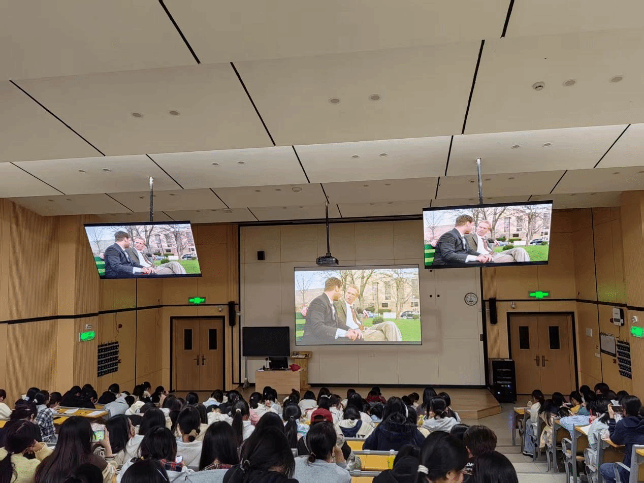 活动现场,主持人通过互动的方式,将同学们进一步带入《美丽心灵》影片,大屏幕上普林斯顿大学的秋叶、黑板上的复杂公式、纳什与虚幻室友查尔斯的互动,以及他与妻子艾丽西亚相濡以沫的瞬间,共同构建了一个真实与虚幻交织的复杂世界。同学们屏息凝神,完全沉浸在影片紧张而温暖的情感氛围中。当看到纳什最终学会忽略幻觉,并在暮年因其卓越贡献获得学界至高认可时,许多同学眼中闪烁着感动的光芒——这个关于理智与情感、崩溃与重生的故事,悄然触动了大家对毅力、爱情与人生价值的深层思考。