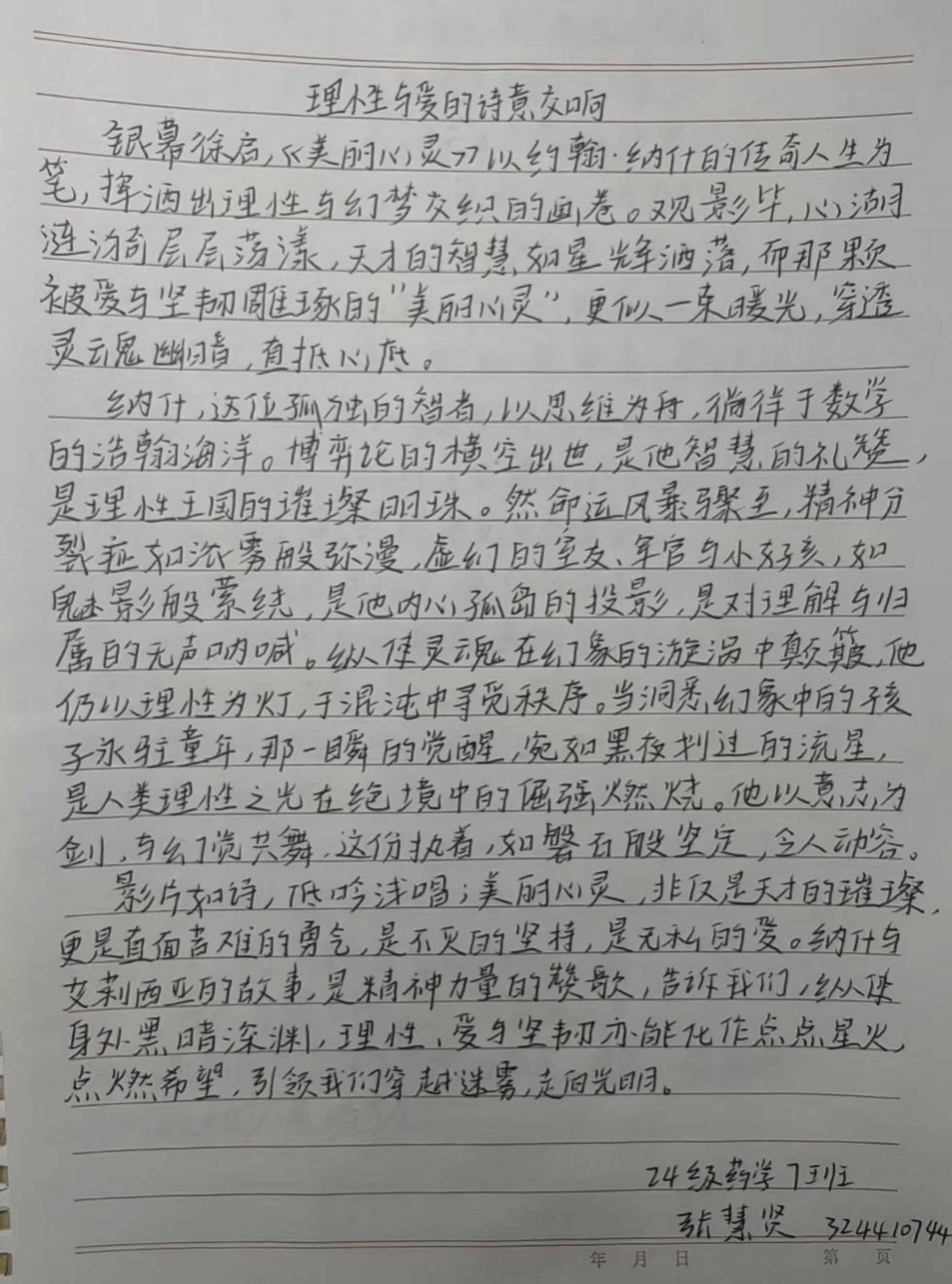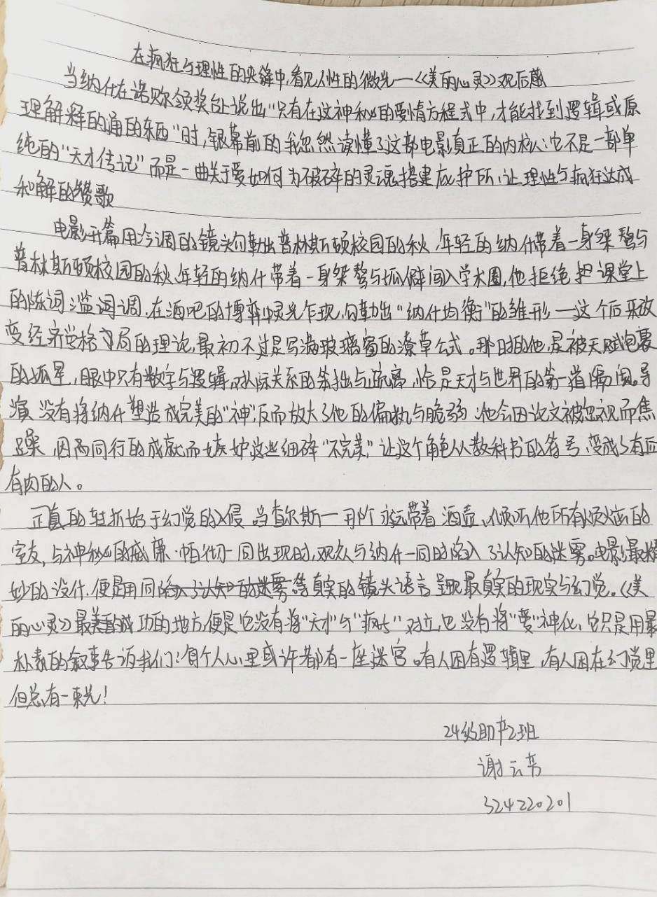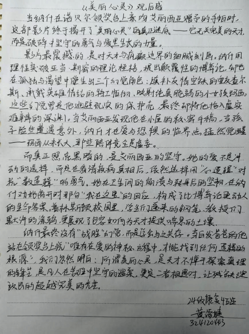 对于正处于自我认知关键期的大学生而言,学业竞争、人际压力与未来规划都可能带来内心的波动与迷茫。而《美丽心灵》正如一剂“信念之锚”,它以真实的故事向同学们证明:心灵的困境并不可耻,关键在于拥有直面它的勇气以及来自周遭的支持系统。影片真诚地诠释了,爱与理解是治愈心灵创伤的良药,接纳不完美的自己与人生,方能真正实现与自我的和解。这种深刻的情感共鸣,为同学们提供了审视自身心理状态的窗口,也让大家看到了在理性与科学的巅峰,同样闪耀着人性与情感的不朽光辉。