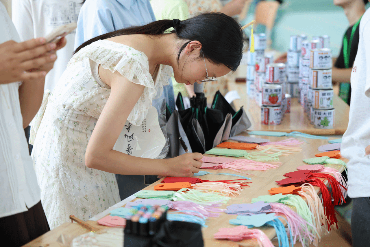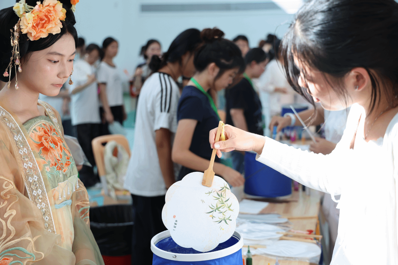 “情绪彩绘站”里,同学们用漆扇挥洒创意,将内心的情绪与色彩巧妙融合。他们或挑选明艳的色彩表达青春的活力与激情,或选用柔和的色调传递内心的宁静与平和。每一把漆扇都仿佛是一幅独特的心理画卷,诉说着同学们不同的心境与故事。在创作的过程中,大家相互交流、分享灵感,不仅释放了压力,更增进了彼此之间的理解与友谊。