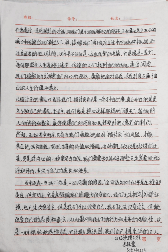 心理健康中心老师通过投影展示《被讨厌的勇气》封面及“课题分离”“共同体感觉”等核心概念,简要介绍了阿德勒心理学的核心理念,为现场交流奠定理论基础。随后,来自护理系的分享者结合自身阅读感悟,以“为什么我们总是害怕被讨厌?”为切入点,深入解读书中“烦恼皆源于人际关系”的观点。她谈到,初读此书时,被“课题分离”理论深深触动——学会区分自己与他人的课题,不畏惧他人评价,才能真正获得心灵自由,这一感悟引发在场学生的强烈共鸣。