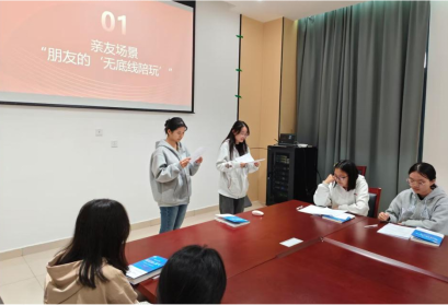 读书会最后进入互动实践环节,围绕“反PUA实验:拒绝讨好,建立边界”主题,现场设置了“PUA倾向的软请求”与“合理需求的模糊边界”两个情景剧本。每个剧本包含4个角色,分别为1名核心“拒绝者”、2名“请求者”及1名“观察者”,剧本台词特意预留“拒绝创作空间”,并融入“同学频繁让其帮忙”“朋友过度索取情绪价值”等贴近生活的情境冲突点。同学们分组代入角色展开情景演绎,“拒绝者”在模拟互动中练习温和而坚定地表达立场,“观察者”同步记录现场互动细节;演绎结束后,各组依次分享感悟,结合演绎过程与自身经历交流心得,在互动探讨中逐步掌握人际边界建立技巧。这场沉浸式实践不仅帮助同学们突破“不敢拒绝”的心理障碍,更引导大家学会在尊重他人的同时坚守自我,为构建健康平等的人际关系、提升心理调适能力注入了实用力量。