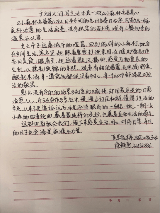 本次活动挑选的影片是口碑治愈片《小森林 冬春篇》,志愿者引导同学们在观影过程中,可以试着放下手机、放下对学业和生活的焦虑,只专注于屏幕上流动的画面和自己当下的感受。影片中,主人公市子告别了城市的浮躁生活,回到从小生长的乡村小森林,在春种秋收、四季更迭的日常里,用一道道亲手制作的家常菜接纳自我、慢慢和生活中的遗憾和解。屏幕里漫山的皑皑白雪、春日抽芽的新绿、锅里咕嘟冒泡的炖煮菜肴,搭配舒缓柔和的旁白,很快就让现场的同学们放下了紧绷的情绪,整个报告厅安静下来,只有影片的声音轻轻流淌,不少同学跟着剧情的推进,或是悄悄红了眼眶,或是跟着市子制作美食的片段露出松弛的笑容。完全沉浸在了这份缓慢温柔的情绪治愈当中。