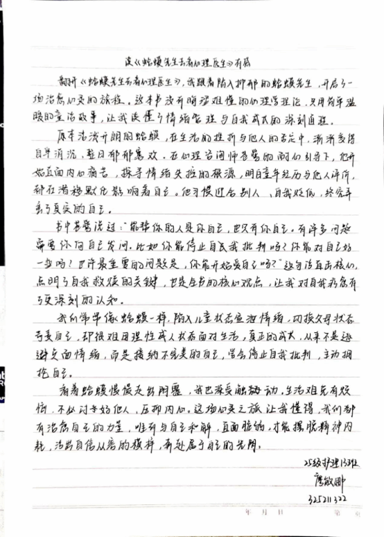 活动接近尾声,在现场同学与老师的共同评选下,本次读书会评选出了一篇优秀观后感。这位同学用真挚的文字记录了自己的成长与思考。
