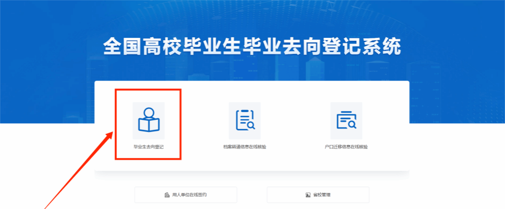 毕业生确认信息无误提交后,进入选择功能模块的引导页。选择“毕业去向登记”模块,用于登记毕业去向及签约信息。