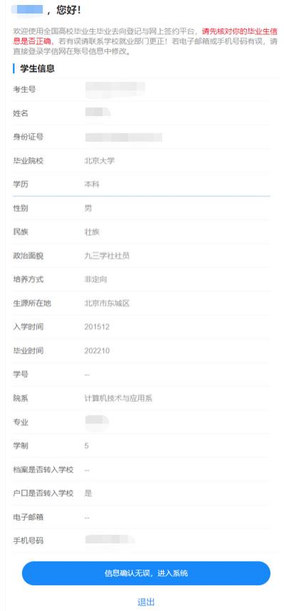 首次登录要核对本人基本信息是否正确。若信息无误,点击“信息确认无误,进入系统”;若信息有误,联系实习就业处更正,手机号码、电子邮箱需由本人在学信网账号信息中修改。请务必仔细核对基本信息,否则会影响后续签约、转档。