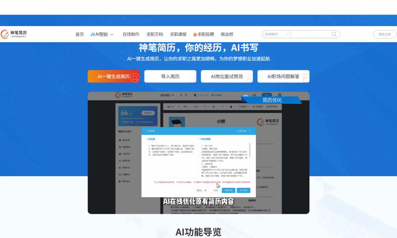 打开神笔简历,即可AI一键生成简历,AI简历服务,AI面试题预测,AI职场伴侣等。