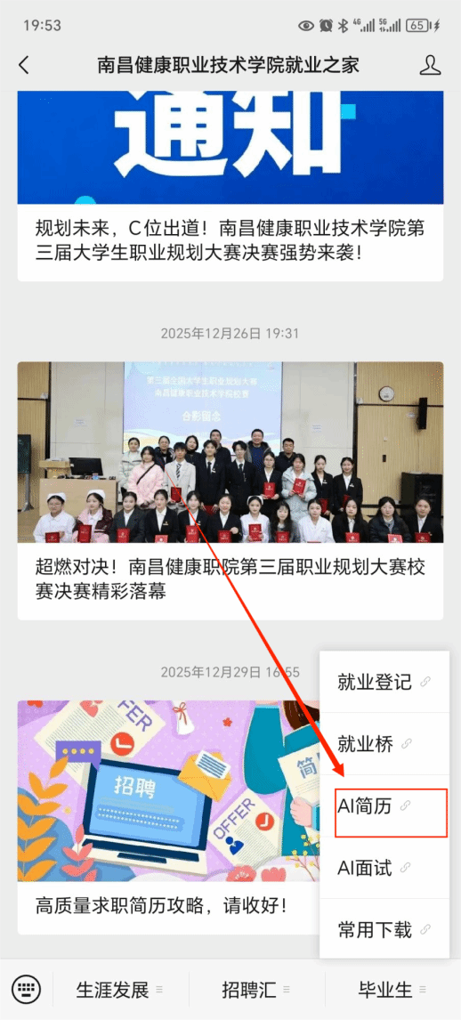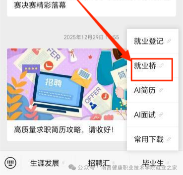 打开手机关注“南昌健康职业技术学院就业之家”点击“毕业生”板块中的“就业桥”