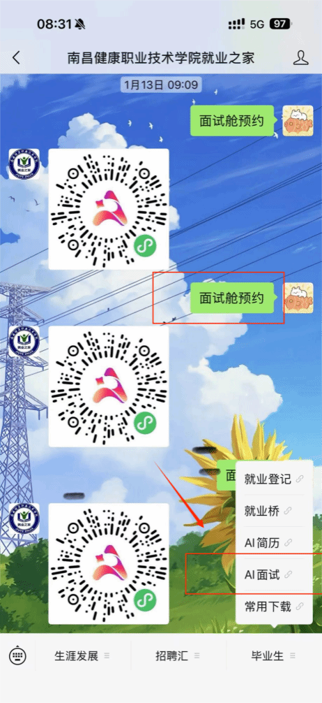 线上使用方式2:打开手机关注“南昌健康职业技术学院就业之家”点击“毕业生”板块中的“AI面试”。同时也可发送“面试舱预约”五个字召唤面试舱预约码进行线上预约。