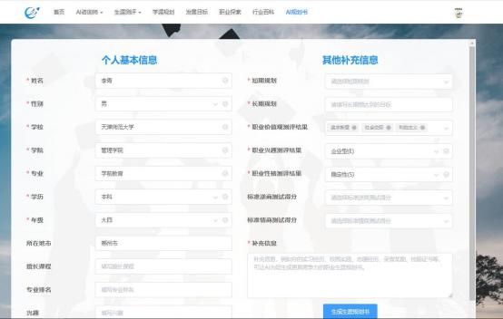 (1) 点击导航栏【AI规划书】模块,填写表单后,点击【生成生涯规划书】