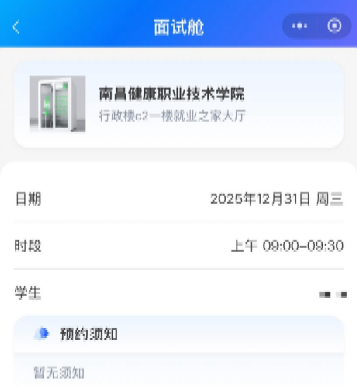 点击预约按钮后,会显示出学生预约面试舱的名称、位置、日期和时间,学生确认无误后,可点击确认预约。