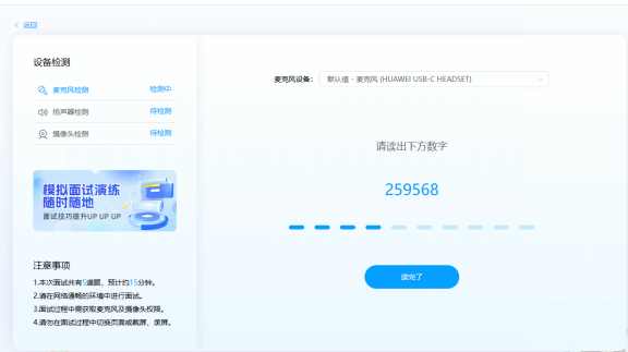 面试需要获取麦克风和摄像头等访问权限,权限获取成功后,根据相关提示完成操作,进入面试