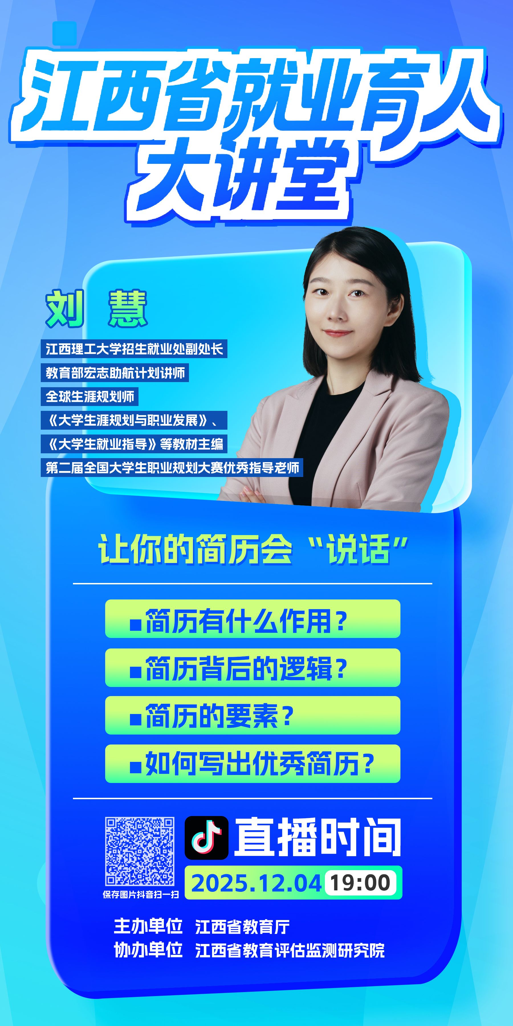 江西省就业育人大讲堂本学年第五期将于本周四晚上7:00开讲,请在校生及26届毕业生使用抖音扫码预约观看。