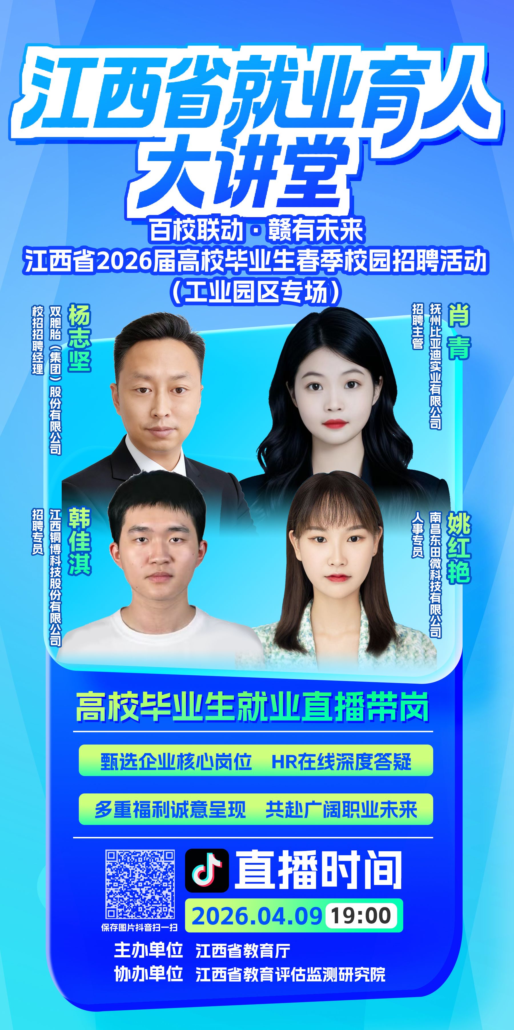 江西省就业育人大讲堂本学年第十三期将于4月9日(本周四)下午19:00开讲,请在校生及26届毕业生使用抖音扫码预约观看。