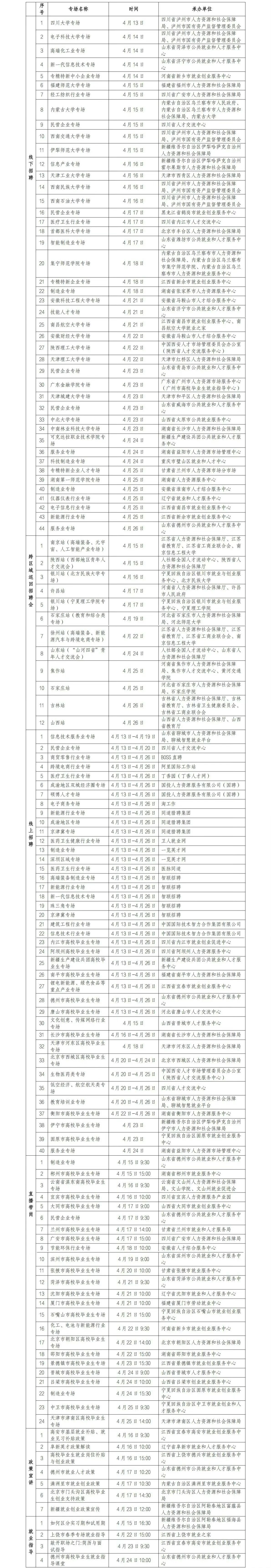 职引未来——2026年全国城市联合招聘高校毕业生春季专场活动启动以来,人力资源社会保障部组织各地各有关机构陆续推出84场面向先进制造、医疗卫生、信息技术、现代服务、新能源等重点行业和京津冀、珠三角、成渝地区等重点区域的线上线下专场(校园)招聘会,12场跨区域巡回招聘会,24场直播带岗,11场政策宣讲和就业指导,共计131场活动,全力为高校毕业生提供有针对性的多元化就业服务支持。