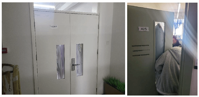 部分实验室存在遮挡观察窗的问题 (当实验室内发生危险时,楼道内的人可以及时通过观察窗发现,应避免观察窗被悬挂的实验服等遮挡)。