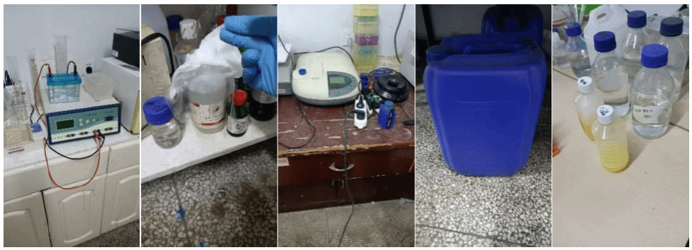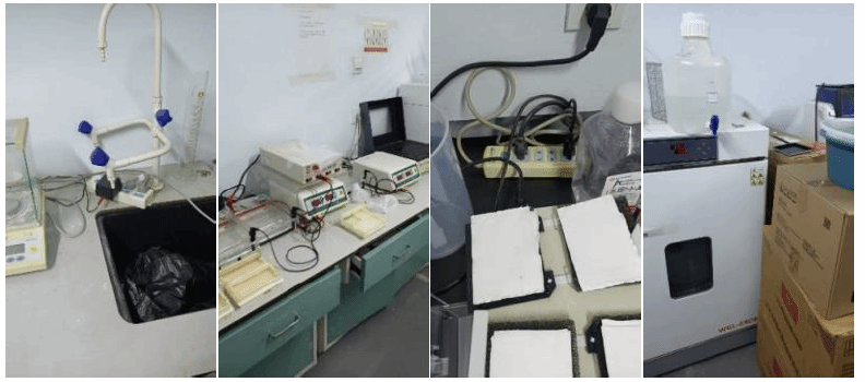 电泳区无警示标识;易制爆化学品(30%过氧化氢)未按规定存放于专用试剂柜中;废液桶无标签没有标明废液成分;电源接线板未进行有效固定;自制试剂无标签。