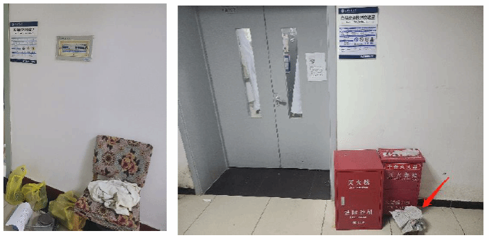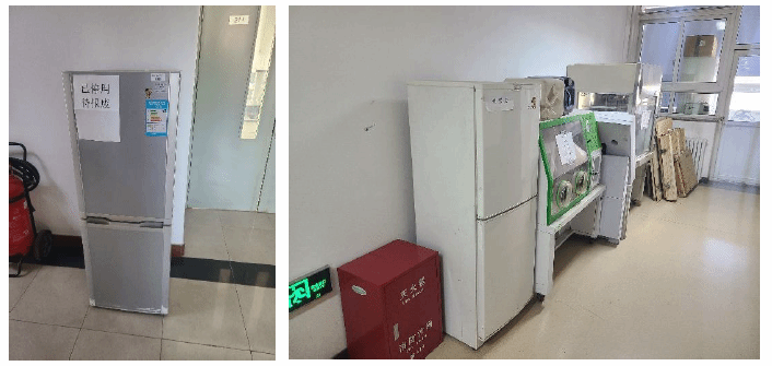 部分“待报废”的冰箱、试剂柜堆放在楼道(拟报废的旧试剂柜和冰箱应尽快提交报废处置流程,仍能利用的冰箱可申请资产调剂)。