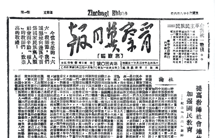 1941年6月6日《晋察冀日报》刊登社论《提高教师社会地位 加强国民教育——纪念“六六”教师节》中央档案馆馆藏