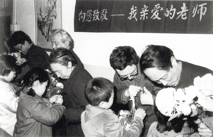 20世纪80年代北京小学的学生在尊师会上为老师们佩戴“园丁纪念章”(选自《中国共产党90年图集》)