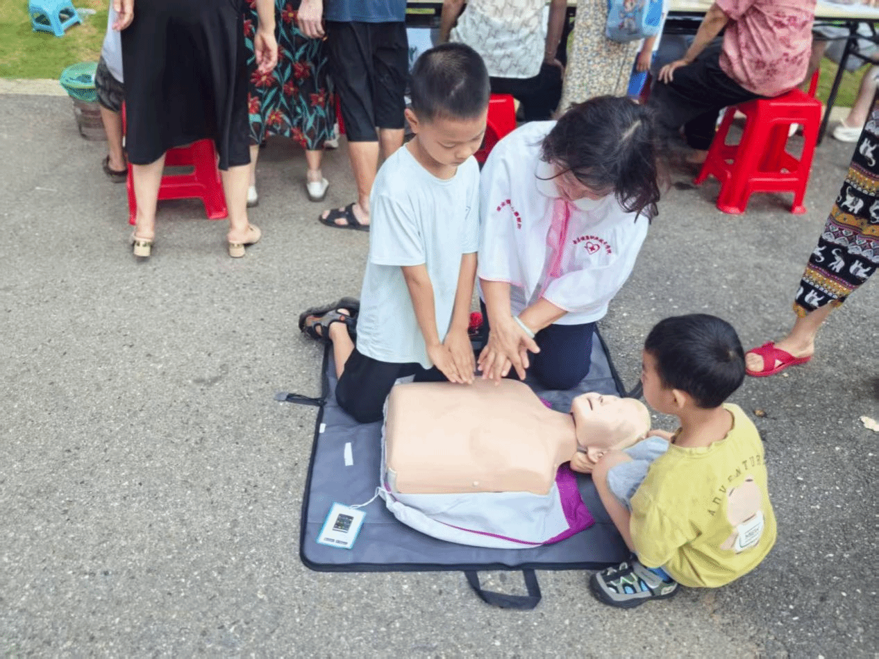 在心肺复苏展示区域,实践队指导老师邓素萍与实践队员陈佳荣借助人体模型,详细讲解了心肺复苏的操作步骤和关键要点,包括如何判断患者是否需要急救、正确的按压位置和频率、人工呼吸的方法等。社区保安何师傅等在实践队员陈佳荣的指导下亲自上手体验。通过实际操作,让居民在实践中掌握急救要点,提升了居民自救互救能力。