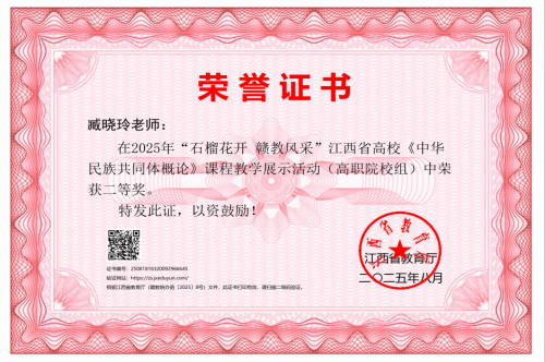 思政部专任教师臧晓玲、邹梦梦积极参与2025年“石榴花开 赣教风采”江西省高校《中华民族共同体概论》课程教学展示活动。两位老师精心准备,充分展现了思政课教师的专业素养和教学风采,其中臧晓玲老师荣获高职院校组二等奖,为学校赢得了荣誉。